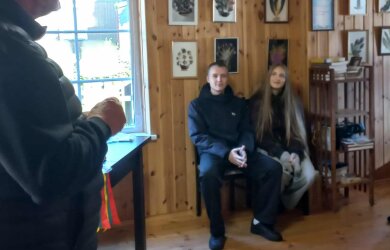 Pirmiausia mokytojas, pasveikinęs atvykus į ,,mažąją Jeruzalę“, visus pakvietė į Švč. Mergelės Marijos Apsilankymo baziliką. Trumpai pristatęs bažnyčios įkūrimo istoriją parodė, kur Vytautas dažniausiai sėdėdavo kunigui aukojant šv. Mišias. Įdomu tai, kad jis atsinešdavo ir savo skaitomą vieną ar kitą knygą. Mat jaunasis poetas, kad numalšintų savo pažinimo troškulį, gana anksti pradėjo skaityti filosofinio pobūdžio knygas, kurios jį įkvėpdavo giliems apmąstymams. Toliau pamoka apie šį iškiliausią filosofinės lyrikos kūrėją buvo tęsiama V. Mačernio muziejuje. Kiekvienas lankytojas pamatė daiktus, informacinius stendus, galėjo pačiupinėti atsitiktinai sprogusio sviedinio skeveldrą, nuo kurios galbūt 1944 metų spalio 7 d. ir žuvo jaunas, be galo talentingas poetas. B. Kleinauskas išsamiai papasakojo apie poeto šeimą, kurioje jis užaugo, daugelio jos narių tragiškus likimus, mokslo metus Šarnelėje, Sedoje, Telšiuose, studijas Kaune, Vilniuje, jaunatvišką meilę, taip ir neįvykusią santuoką su Brone Vildžiūnaite, jo kūrybos kelią, pirmąjį eilėraščių rinkinį, išleistą ne Lietuvoje.